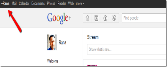 Setelah Anda menerima undangan Anda untuk bergabung dengan + G, Anda akan diminta untuk memasukkan nama, alamat e-mail, tanggal lahir dan jenis kelamin untuk memulai. Setelah menyelesaikan rincian ini Anda akan login dan bisa menemukan account Anda di sudut kiri atas browser Anda seperti ditunjukkan di cor layar di bawah ini.